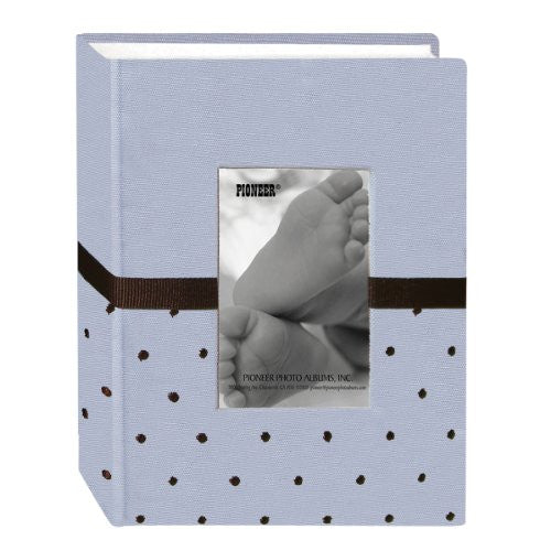 This photo album holds 100 4-inch by 6-inch photos in optically clear plastic pockets. The album is bookstyle bound in baby blue embroidered fabric and features a frame front. Photos are displayed one per page.