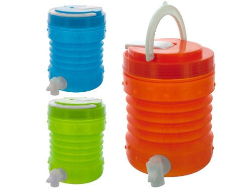 This collapsible drink container is a convenient way to carry and travel with your favorite drink. It unique design is modeled after a large sports cooler but is perfect for personal use and easily holds 1.5 liters of liquid. Features include: a sturdy handle, a bottom spout for filling cups and a flip top for drinking straight from the container. Comes in assorted colors including lime green, orange and turquoise.