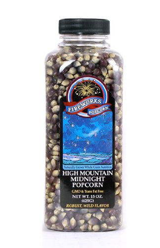 Fireworks® Popcorn High Mountain Midnight 15 oz. Jar. A jewel tone blue popcorn with a robust, wild flavor. Our High Mountain Midnight pop's up bright white. Small farmers throughout the Midwest grow our popcorn exclusively for us to meet our exacting standards. No dyes are used to enhance the beautiful colors of our corn. It's all compliments of Mother Nature. Fireworks® Popcorn grows the same varieties of corn that our Grandparents enjoyed, tender and full of naturally good flavor. Because our corn is not genetically altered (contains no GMO's) or crossed with low grades of "field" corn they will pop smaller but have very tender hulls that shatter when popped. Fireworks® Popcorn is easier not only on dental work but also the digestive system. At 120 Calories for each 5 cup individual serving, Fireworks® Popcorn is loaded with 7 Grams of fiber making it the perfect all natural, healthy snack!