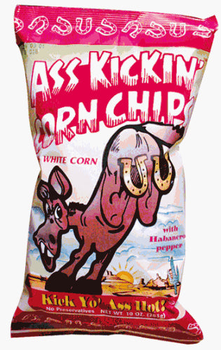 Take the best darn corn chips in the southwest, treat 'em with enough Ass Kickin' seasonings to singe the fringe on your chaps and you have Ass Kickin' Corn Chips!