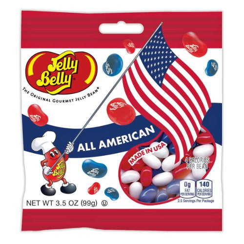 All American Mix jelly beans in a 3.5 oz bag. Perfect for showing your American pride. 2.625 lb case of All American Mix. Jelly Belly salutes the flag and America with this fun bag. Each 3.5 oz bag is filled with patriotic colors: Very Cherry, Coconut and Blueberry. It's the perfect candy for your next BBQ. All Jelly Belly jelly beans are OU Kosher, gluten free, peanut free, dairy free, fat free and vegetarian friendly. To preserve freshness, 2.625 lbs. cases will be packed as 12 individually-sealed 3.5 oz bags.
