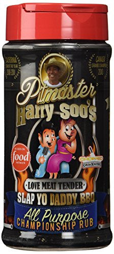 All Purpose - is Harry's most popular rub and is awesome on pretty much anything including beef, pork butt, ribs, chicken, vegetables, and tofu. It's so versatile it can be used on mashed potatoes, grilled watermelon, scrambled eggs, stir fried noodles, Paella, shrimp-boils, or even spice up your popcorn. Some folks have even replaced the salt and pepper shakers in their kitchen with this seasoning as it really wakes up the flavor of home cooked dishes. Due to customer requests, it comes in three other versions packaged in plastic bags: Low-Sodium, Hot, and MSG. The MSG version contains small quantities of an FDA-approved flavor enhancer which is a popular choice among barbecue competitors who like this product. Ingredients: Sea salt, maple sugar, granulated garlic, cane sugar, chili, paprika, chipotle powder, black pepper, rosemary, hickory smoke, cayenne pepper, cornstarch, soy lecithin, natural flavors, silicone dioxide (anti-caking)