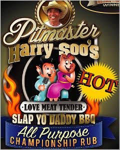 All Purpose - is Harry's most popular rub and is awesome on pretty much anything including beef, pork butt, ribs, chicken, vegetables, and tofu. It's so versatile it can be used on mashed potatoes, grilled watermelon, scrambled eggs, stir fried noodles, Paella, shrimp-boils, or even spice up your popcorn. Some folks have even replaced the salt and pepper shakers in their kitchen with this seasoning as it really wakes up the flavor of home cooked dishes. Due to customer requests, it comes in three other versions packaged in plastic bags: Low-Sodium, Hot, and MSG. Ingredients: Sea salt, cane sugar, maple sugar, granulated garlic, chili, paprika, chipotle, black pepper, parsley, hickory smoke, spices, cornstarch, soy lecithin, natural flavors, silicone dioxide (anti-caking)