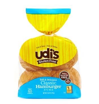 Udis Gluten Free Classic Hamburger Buns - 4 per pack -- 8 packs per case. Grilling in the backyard has never tasted so good and it s gluten free. Our soft, golden buns accompany your much loved ingredients, be it a classic burger or a savory deli sandwich.