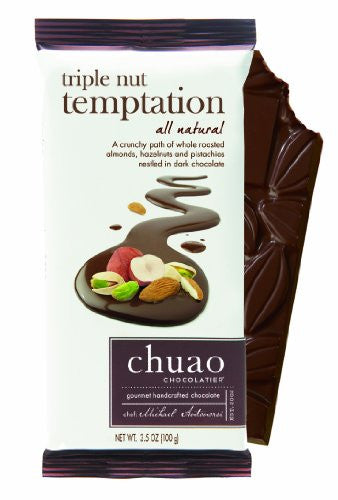 Luscious dark chocolate is studded with crunchy whole roasted almonds, hazelnuts and pistachios. Triple Nut Temptation is pure bliss for those enlightened beings who are nuts about nuts. Formerly known as Caracas Dark.