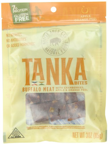A great alternative to the usual processed beef jerky, Tanka Apple Orange Peel Bites feature whole foods including prairie raised buffalo meat and tart sweet cranberries combined with apples and orange peel in resealable 3 ounce packages of bite size nuggets. The crisp sweet apples and the tang of orange peel give the slow smoked buffalo a great citrus punch in a convenient, high protein, eat as you go snack pack. Based on a traditional Lakota recipe for wasna or pemmican, Tanka Bites are 100% natural and only 70 calories per serving. Throw some of these low carb, healthy snacks in your purse, your backpack or your saddlebag to enjoy on the trail. Tanka Bites are gluten free, nitrites free, MSG free, hormone free, dairy free, soy free and low fat. The tanka bar spicy is an authentic Native American food and deliciously suited for nearly every diet lifestyle.