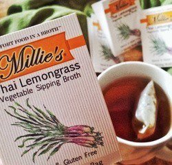 A citrusy blend of lemongrass spices & green tea.This Thai Lemongrass Sipping Broth is a citrusy blend of lemongrass spices & green tea. This first-of-its-kind savory single serve hot beverage delivers an amazing taste using the highest quality vegan natural wild harvest organic and gluten-free ingredients. It really is Comfort Food in a Broth.Millies Vegetable Sipping Broth is a single servingSteepablethat was created by a school teacher who needed a snack between classes and flavors inspired by her mom Millie. This first-of-its-kind savory hot beverage delivers an amazing taste using the highest quality vegan natural wild harvest organic and gluten-free ingredients.It really is Comfort Food in a Broth.Ingredients: organic vegetable blend (carrots celery onion) sea salt yeast extract garlic lemongrass lime green tea herbs & spicesNutrition Facts:Serv. Size: 1 packetAmount Per Serving: Calories 15Fat Cal 0Total Fat 0g (0% DV) Sat Fat .0g (0%DV) Trans Fat 0g Cholest. 0mg (0%DV) Sodium 260mg (11%DV)Total Carb. 0g (0%DV) Fiber 0g (0%DV) Sugars 0g (0%DV) Protein 0g (0%V) Vitamin A (0%DV) Vitamin C (0%DV) Calcium (0%DV) Iron (0%DV) Percent Daily Values (DV) are based on a 2000 calorie diet.75% less sodium thanbouillonGluten free and all vegetable ingredientsConvenient single serving broth bagWe know youll like it!"They are the perfect thing for an afternoon break when you dont want something sweet but still want a bit of a pick-me-up. I LOVE the Thai Lemongrass flavor..." - Mev Pacific NW9 Xsingle servingSteepables per travel pouchMaking The Perfect Cup ofMillies Sipping Broth