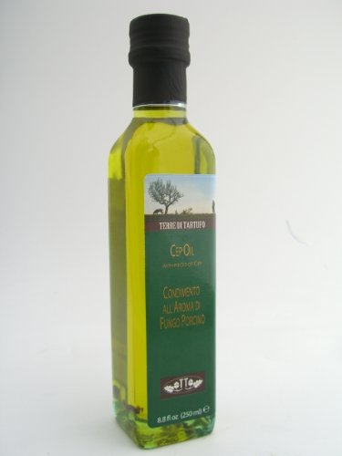 Porcini Mushroom Oil. Price per 8,4 fl.oz bottle. These Porcini mushroom oils are intensely flavored and convenient to use. The unique rare essence of the coveted Porcini Mushrooms is captured and infused in extra virgin olive oil. Use as a finishing oil - drizzle over any Porcini Mushrooms dish will give more great intense taste to your plate, fantastic on grilled meats, pasta, grain or potato dishes and soups.