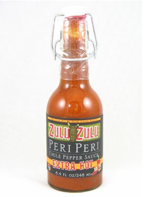 Zulu Zulu Xtra Hot Hot Sauce (8.4 oz/ 200 ml): This Xtra Hot sauce is made from all natural ingredients. Peri Peri Chile Pepper Sauces is a flavorful condiment that adds passion and taste to chicken, fish and meat dishes especially on the grill. Peri Peri or Pili Pili was found in Africa nearly 400 years ago. The origin of the African Bird's Eye Pepper is not known. It is believed perhaps that the Portuguese and Spanish explorers introduced the pepper to Africa.