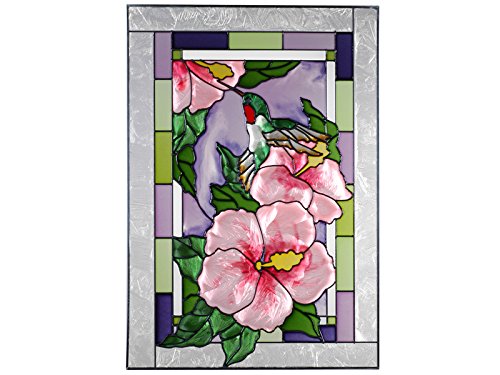 Here's a vertical composition of our popular hummingbird and hibiscus art glass panel. Zinc-framed, this vertical panel measures 14" wide x 20.5" high, and features two soldered metal rings along the top for hanging. We will include a chain hanging kit for your convenience. This is a custom order, and the average receipt time is 7 to 10 business days from time of order. The picture is shipped from the manufacturer.