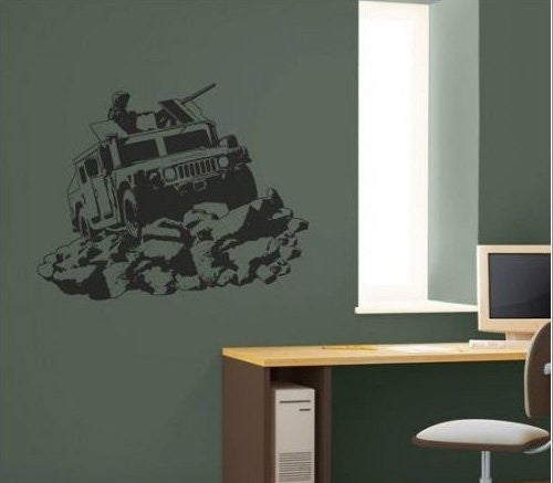 Inspire hours of imaginative adventure patriotic spirit with this amazing Humvee Sudden Shadows peel and stick wall mural. Perfect to blend with any paint color, this humvee mural applies easily to the wall and will create an awesome atmosphere for years to come. Packaged as (3) separate pieces. Overall dimensions are 35.5 x 25.5". Semi-transparent design allows your wall color to show through! Will not damage surfaces, as easy to remove as they are to apply. Quick and inexpensive solution to decorating on a budget. Self-Adhesive - Removable - Repositionable.