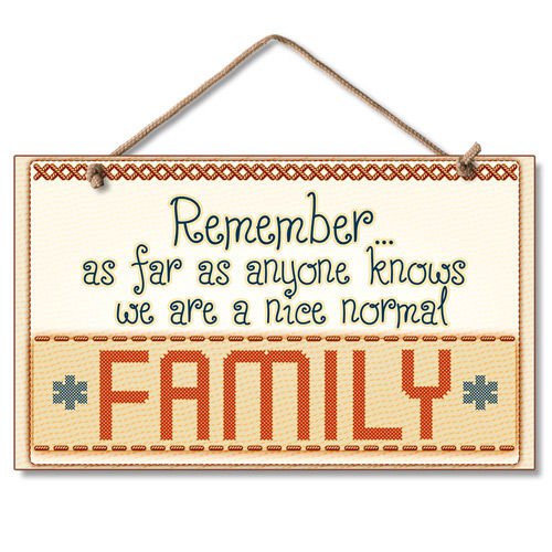 Sentiment says "Remember As Far As Anyone Knows We Are A Nice Normal Family" , 9" x 6" Wood Sign , Rope Hanger , Made in the USA