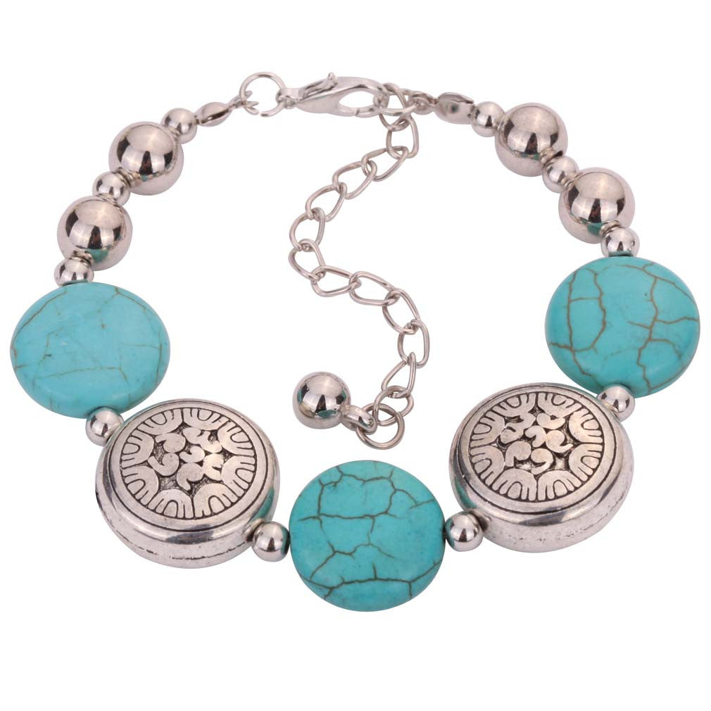 Go rustic with this beautiful silver and turquoise medallion bracelet. Features an adjustable length with lobster clasp.