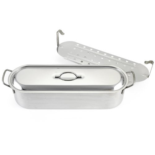 Enjoy tender, delicate poached fish from your own kitchen with this 3-piece fish poacher. The long and narrow design makes it perfect for whole fish and fillets. The sturdy stainless steel construction ensures many, many years of reliable use. Set includes 18-inch pan, removable perforated tray and lid. Dishwasher safe.