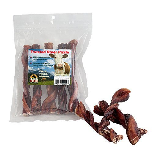 Great Dog Twisted Steer Pizzle (bully sticks) is sold in a bag containing 5, 6" pieces. Each chew is made by twisting two, all natural beef steer pizzle together before being slow roasted into one tasty dog chew! Twisted Steer Pizzle is a fantastic chew, bringing long lasting chewing pleasure to your dog while helping to keep teeth and gums clean. Our all natural Twisted Steer Pizzle is sourced from family farms in the Midwest. It's a great alternative to rawhide. What's not to love?