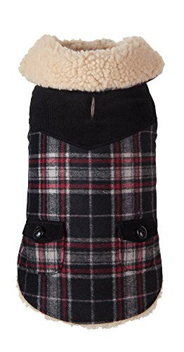 Shearling Lined Wool Plaid Jacket in Black with black corduroy detail LENGTH 15" - 17", CHEST 18" - 21", NECK 10" - 12", LBS 18 - 25.