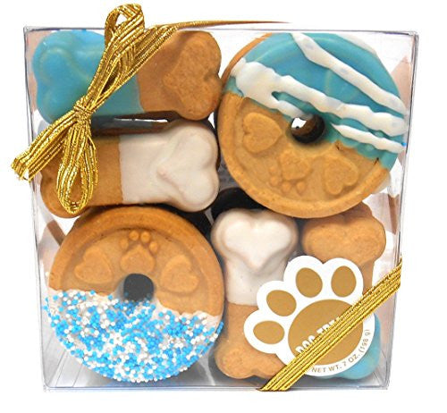 Boys love blue! What better way to celebrate the unconditional love your puppy shows you daily then by choosing these tasty whimsical Blue Buddies treats designed for the canine boys? This signature gift package by Claudia's Canine Cuisine is embellished with a gold paw print and bow. It makes a perfect gift for giving. It is also sized perfectly for traveling. Filled with fresh-baked treats, some are hand-decorated while others are delightfully natural and super delicious. These premium gourmet canine cookies are made in the USA with the finest 100-Percent USA human-grade ingredients.