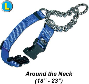 Cetacea chain martingale collars are one of your best choices for a quality training collar. Dog trainers and vets recommend this type of collar when a correction collar is needed. The martingale collar is fashioned after equine designs providing a form of a limited choke collar. The exceptional feature of a martingale collar is that the slip function can be limited to not over-choke your pet. To make the Cetacea martingale more practical than other brands we use a quick release buckle so that the collar can be put on or removed from your dog's head without having to readjust the length.