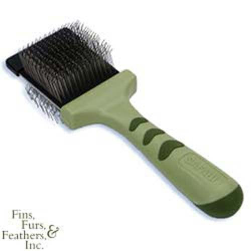 Coastal Pet double sided flexible slicker provides ultimate comfort. The head flexes to conform to the special contours of dog to gently remove tangles and loose hair from the inside of the legs, tail, head and other sensitive areas. Extra-long, stainless steel pins penetrate deep into the coat to remove loose undercoat. The soft pins are perfect for light jobs. Firm pins work through mild mats. Non-slip grip makes grooming easy. The ergonomic design provides comfort when brushing. Available in small size.