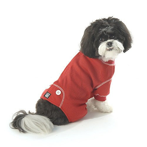 PetRageous Designs, Cozy Thermal PJ's Pink w/White Stitching, in small are comfortable pajamas for your dog. They feature a waffle weave thermal knit with faux back flap, decorative buttons and contrast topstitching. The back closer holds them securely on your dog while the pattern will keep them looking cozy.