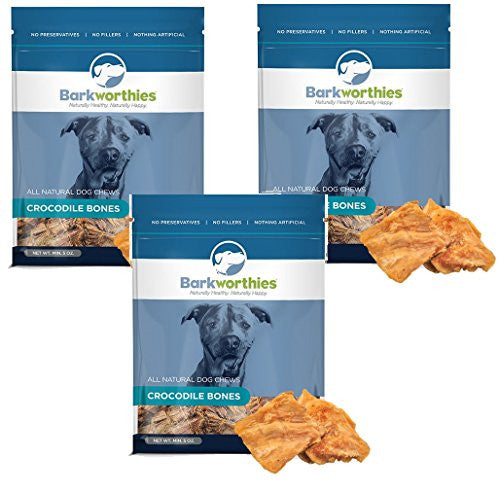 Barkworthies crocodile bones are all-natural chews made from all-natural Australian crocodile raised without antibiotics or hormones. A great alternative to pork, beef and chicken, these tasty treats are high in antioxidants. Unlike traditional rawhide which may cause intestinal blockage if swallowed, they're also fully digestible. The size and shape of these bones will vary, but all of them are approximately fist-sized. our Crocodile bones are loaded with lots of other benefits for your intrepid pet. An all-natural source of glucosamine and chondroitin, these chews can help with joint and mobility issues. They're a wonderful source of omega 3 & 6 fatty acids with immune boosting properties. The chewing action while consuming our crocodile bones also helps prevent tartar buildup and promotes healthy teeth and gums. Please note that this product is not for human consumption. Please supervise your pet while giving a treat or chew. as With all of our products, Barkworthies crocodile bones are additive-free, chemical-free and preservative-free. Moreover, most Barkworthies products are all-natural, single-ingredient chews, which means they're 100% healthy and safe.