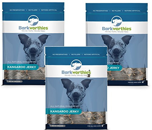 Barkworthies natural kangaroo jerky is an all-natural chew made of free-range Australian kangaroo. Completely digestible and hypoallergenic, it makes an ideal treat for dogs with allergies or sensitive stomachs. Rich in iron and zinc plus vitamins b6 and b12, this jerky is as healthy as it is tasty! low in fat and high in antioxidants, our kangaroo jerky is a natural source of nutrients like iron, zinc and vitamins b6 and b12. Chewing on our kangaroo jerky is also a great way to promote good doggy dental hygiene! as with all our products, Barkworthies natural kangaroo jerky is additive-free, chemical-free and preservative-free. Moreover, most Barkworthies products are all-natural, single-ingredient chews, which means they're 100% healthy and safe.