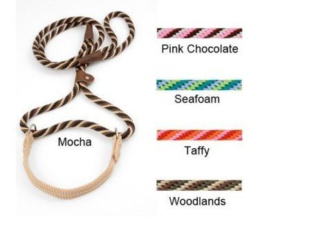This martingale style collar and leash in one is designed for training, exercise, show and field. The soft and pliable neckband is accent with brass rings. All materials used are colorfast and non-corrosive. Proudly made in the USA.