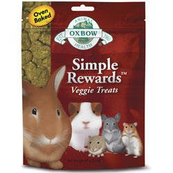 Oxbow Simple Rewards Treats Would you like to reward your special small pet while rewarding his health at the same time? Look no further than Simple Rewards Veggie Treats. The wholesome, oven baked blend of vegetables and greens in these Veggie Treats translates into a tasty, enriching reward for your pet. This vegetarian formula is low in calcium and protein, with a balanced protein to fiber ratio. These treats provide the nutritional balance animals would fin