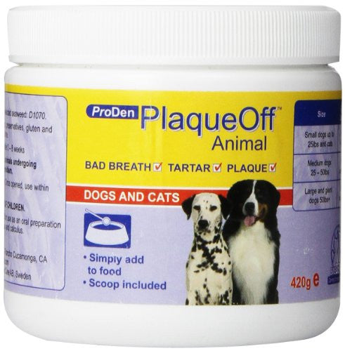 Proden plaqueoff animal is an easy way for those dog and cat owners to care for their pet's teeth who don't have the patience or inclination to brush their dog or cat's teeth regularly. The product comes in powdered form and it is simply added on a daily basis to dry or wet food. Dogs and cats like the taste of the small amount that is added. Proden plaqueoff animal does not rely on topical application or friction. The product is ingested and works systemically. The natural compound in the product comes out through the saliva and works to break down the bacterial biofilm that forms on the teeth and gums. This is how the natural bacteria in the mouth take hold onto the teeth and gums, colonizing and creating the oral problems of plaque and tartar, bad breathe and gingivitis. It does not change the ph of the mouth or kill off the normal levels of bacteria. Proden plaqueoff has been proven to reduce plaque and tartar on the teeth and gums, depending on composition, diet and how long it has been there. It then works to prevent bad breath, plaque and tartar from returning. Patients generally begin to see results over a 2-8 week period, and will see further benefits with continued use. Proden plaqueoff animal is made from a specific strain of selected seaweed harvested from above scandinavia. This seaweed has developed a natural defensive mechanism against bacterial biofilm. The product is made only from this seaweed and has no additives or chemicals added. It is human grade and human tested.