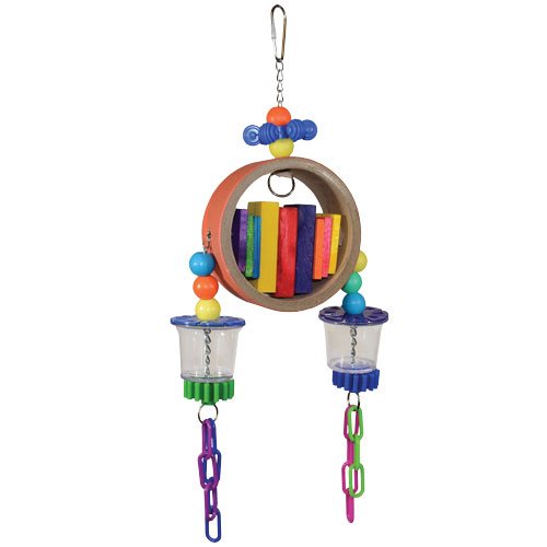 Brightly colored beads, chain, spinning gears, and wood blocks and slats embellish this large cardboard birdie bagel while the two clear acrylic cups dangle and dance as your bird attempts to retrieve its treats. Great foraging toy.