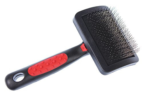Universal Type Small Slicker with a curved brush head and stainless steel hard pins. Grips are comfortable and non-slip. Brush penetrates coat and removes loose hair without damaging coat. Great for all sized dogs and breeds with medium to long hair.