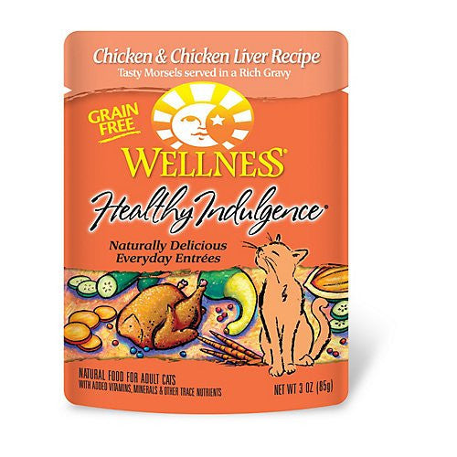 Wellness Healthy Indulgence Chicken Wet Cat Food 24 Pack Wellness Healthy Indulgence Chicken is ideal for even the most finicky feline. Chicken is the first ingredient, providing high quality protein. Cranberries and blueberries, packed with antioxidant phyto-nutrients, help maintain proper urinary tract health. Vegetables, such as sweet potatoes and carrots, provide natural sources of antioxidants. Flaxseed, naturally rich with Alpha-Linolenic Acid and Omega 3 Fatty acids, are great for maintaining healthy skin and a shiny coat. Wellness Healthy Indulgence is a healthy and delicious way to help increase your cat's water intake. Free of corn, wheat, wheat gluten and soy, it is an ideal choice for cats with food sensitivities. There are no artificial flavors or colors. Made in the USA, so you know you are giving your best feline friend a quality product. Features: For adult cats High quality protein sources Complete and balanced nutrition Helps maintain proper urinary tract health Great for healthy skin and shiny coat Helps increase cat's water intake Highly palatable Free of wheat, wheat gluten, corn and soy Contains no artificial colors or flavors Made in the USA Item Specifications: Flavor: Chicken and Chicken Liver Size: 3oz pouch, case of 24 Guaranteed Analysis: Crude Protein: min 8.0% Crude Fat: min 4.0% Crude Fiber: max 1.0% Moisture: max 82.0% Ash: max 2.5% Magnesium: max 0.025% Taurine: min 0.10% Ingredients: Chicken, Chicken Broth, Water, Chicken Liver, Egg Whites, Potato Starch, Carrots, Pea Fiber, Sweet Potatoes, Squash, Zucchini, Guar Gum, Sodium Phosphate, Natural Flavor, Cranberries, Blueberries, Tricalcium Phosphate, Flaxseed, Potassium Chloride, Sodium Carbonate, Taurine, DL-Methionine, Iron Proteinate, Beta-Carotene, Zinc Proteinate, Vitamin E Supplement, Choline Chloride, Cobalt Proteinate, Thiamine Mononitrate, Copper Proteinate, Folic Acid, Manganese Proteinate, Niacin, d-Calcium Pantothenate, Sodium Selenite, Vitamin D-3 Supplement, Pyridoxine H