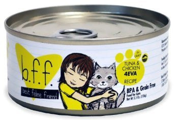 B.F.F. Tuna and Chicken 4EVA is a luxurious, natural cat meal featuring tuna and chicken in gravy. Each meal is prepared with practices common in human food products, including only the top quality meat parts. The tuna prepared for this meal are human grade fish that are caught live and not farmed while using dolphin safe practices. Only free range, antibiotic and hormone-free chicken is used. This meal is high in quality protein and moisture content while remaining low on carbohydrates. It is BPA and Grain free, while made in a human food facility. B.F.F. has a natural real meat texture and flavor that your cat will love! Natural food for cats Made in a human food facility Grain Free
