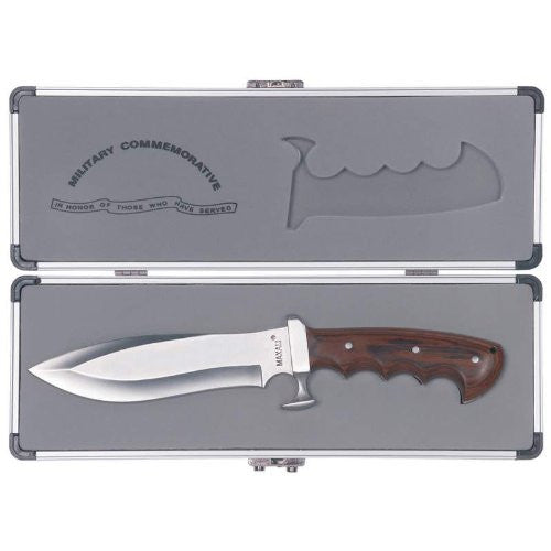 11 1/2" Military Commemorative Knife by Maxam. Whether you are a veteran, your uncle or grandpa is a veteran, your best friend is currently enlisted or you're simply proud to be an American... this is a Knife you'll cherish. This Maxam Commemorative Knife comes protected in an aluminum case. Quality construction and an attractive design you'll be proud to display: 440 stainless steel 6 3/8" blade is engraved with the above quotation; Stainless steel finger guard; Wood handle; Full-tang construction for balance; Knife measures 11 1/2"l. overall; Aluminum case measures 12 3/4 x 4 3/8 x 1 1/2", 2 lbs. China. Order this collectible today! WARNING: You must be 18 or older to purchase Bowie Knives. Bowie Knives cannot be shipped to CA; CO; CT; AL; FL; ID; Peoria, IL; D.C.; MA; Canada or Puerto Rico. Bowie Knives cannot be shipped Parcel Post. Please check your State, County and City laws for restrictions before ordering Bowie Knives. 11 1/2" Maxam Military Bowie Knife with Case. Engraving on Knife is an Example Only.