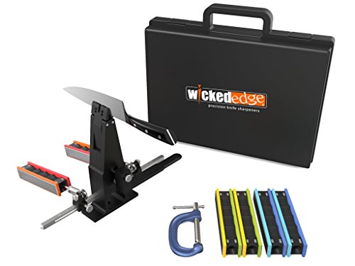 The 2017 Field & Sport Pro Knife Sharpener is the portable version of the WE130 plus the 800/1000 diamond handle set. It features a lightweight carrying case and easily clamps to any firm surface with the included C-Clamp. There is a simple, easy to use angle adjustment with 1° increments ranging from 13°-35°, ball joint pivots and micro angle adjustments. The 2017 model has the newly designed Generation 3 Vise for one step clamping. The new vise includes a fully enclosed cam, a tension adjustment lever to control the clamping tension of the vise, and split jaws which make it more effective at clamping distally tapered and fully-flat-ground blades. The Vise is self centering which keeps the angle on both side of the knife symmetrical, and free floating which makes it ideal for clamping fully-flat ground blades. The L brackets have also been redesigned with a different shape of the L-bracket and incorporated a jam-nut locking system which secures the micro adjustment feature. Features: Coarse 100 Grit / Medium Coarse 200 Grit Diamond Stones handle set; Medium 400 Grit / Fine 600 Grit Diamond Stones handle set; Extra Fine 800 Grit / Ultra Fine 1000 Grit Diamond Stones handle set; Guide Rod pivots: Ball-Joint/L-bracket; Angle Range: 13-35 degrees; Angle Setting: Manual, independent angle adjustment on both sides of the sharpener; Main angle Adjustment: 1 degree increments; Micro Adjustment: continuous sub 1 degree adjustment; Vise: Fully enclosed Generation 3 Vise; Clamping System: Generation 3 Cam-Lock Jaws with Lever and tension adjustment to accommodate different blade thicknesses; Jaws: Split jaws which will flex to firmly clamp distally tapered blades; Knife Alignment: Standard Wicked Edge Alignment Guide; Blade Depth Regulation: Standard Wicked Edge Depth Key with two settings for height adjustment; Guide Rod Length: 10 inches; Max Clamping Width: 3/16" *Attachment for 1/4" Blades is available separately; Base: C-clamp;
