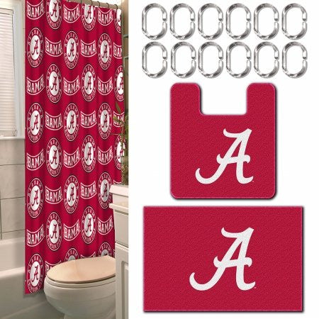 The official Collegiate 15-Piece Bath Set by The Northwest Company enables all college fans to transform their bathrooms into a real fan-zone! Color-coordinated to match your favorite team?s bold colors and decorated with the team logo this convenient value set is the perfect gift for any super fan! This all-in-one kit includes 12 Shower Curtain Rings 1 72?x 72? Shower Curtain and 2 Contour Bath Mats with Non-Skid Backing. Show off your team pride somewhere other than the bedroom! Shower curtain & bath mats are machine washable.