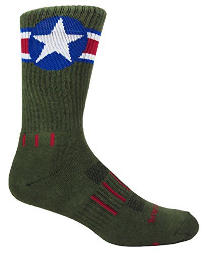 Celebrate your American Colors! Feel like Captain America in these one-of-a-kind premium USA themed MOXY Socks! Complete with a bold American Star with a stripe wrapped around the entire sock. As always comes with the MOXY performance foot, specializing in achilles heel and arch support protection. Army Green with Red, White, and Blue. One Size Fits All, Unisex Adult.