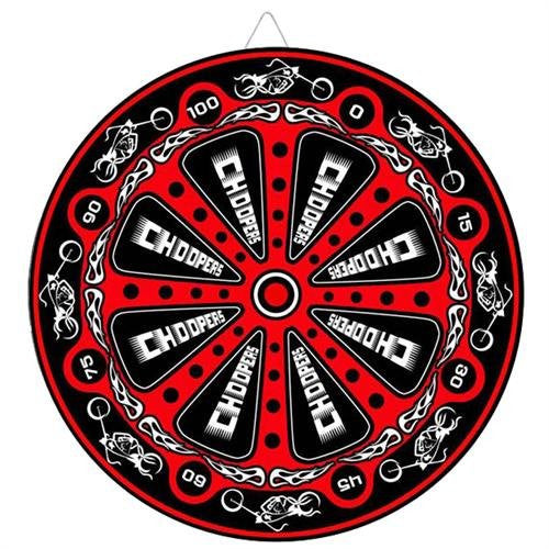 Nail your target dead in the center after practicing on this 14.5 inch diameter medium density synthetic Skull Target Board. Perfect your speed, range, and accuracy by trying to hit the target right in the middle. This Dart Board offers an intricate design of Motorbike Artworks followed by a Red and Black background with the word Choppers and biker flames accent. The synthetic foam corkboard works with throwing knives, throwing stars, blowguns, kunai, and darts. You could even use this with a crossbow or bow and arrow. Hang it up outside or in your basement at a safe location and please understand the safety precautions. It comes equipped with a hanging hook. *Proper Use: Hang the dart board so the backing is directly against a flat surface, like plywood, a wall, etc.