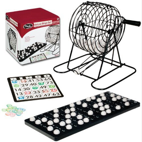 These deluxe bingo game sets include an 8 inch tall Bingo cage wheel, a ball tray, 18 bingo cards, 150 marker chips and 75 balls.
