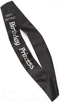 Black satin sash with 'Birthday Princess' written in white, and 'HAPPY BIRTHDAY' written in small diamante stones.