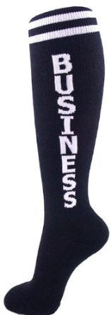 Takin' care of ..... you guessed it ... BUSINESS! Inspired by classic '70s tube socks, our Business socks are black with two white stripes around the top with BUSINESS spelled down each calf in bold red letters. Design is woven in, not screenprinted. Unisex design fits most - women's shoe size 7 - men's 13. Socks reach to the knee on persons 5'2" - 6'2" (so they'll be over-the-knee socks on petite folks and mid-calf height on big birds). Made in the U.S.A. of 75% cotton, 20% polyester, 5% spandex to comfortably fit most leg shapes. Unlike old school tube socks, our Business socks have a heel and a cushioned foot for enhanced fit and feel. Sold as pair. Machine wash cold. Line dry. A Gumball Poodle original.