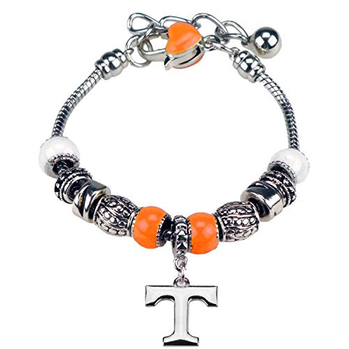 This designer inspired charm bracelet features the Tennessee logo charm with matching school colored beads. It includes a Team logo charm, TN colored beads, Heart Clasp closure and a 2" extender.