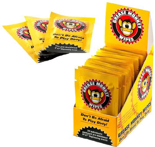 Grease Monkey Wipes use a powerful, citrus formula to safely clean grease, grime, oil, lubricants, adhesives, ink and much more. No soap and water? No problem. Pre-moistened Grease Monkey Wipes are ideal for cleaning mobile messes associated with biking, boating, driving, fishing, hunting, camping, and much more. This is one 24 count box of individually wrapped wipes. Perfect for the garage and on the go.