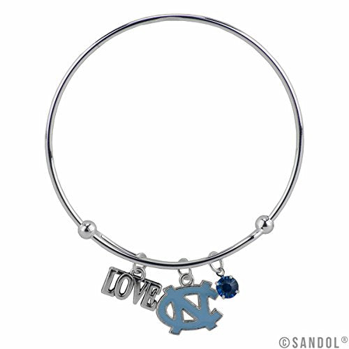 Proudly represent your love for your team with this beautiful expandable wire bangle. This designer inspired North Carolina Tar Heels bangle adjust easily on your wrist to get the perfect fit. This silver wire bangle comes with 3 dainty charms - love, team logo, and team color bead.