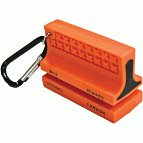 26-310-635 (blister pack) • Pocket-size knife sharpener with carabiner clip • Two stage sharpening: Fine ceramic & coarse carbide • Case: Hard plastic • Dimensions: 2.25” x 1.5” x 1” • Weight: 1 oz.