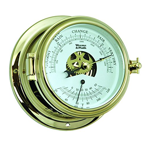 Light, strong and durable, the Endurance II Barometer/Thermometer in brass finish is a two-in-one instrument that conveniently combines barometric pressure and temperature gauges in one location. The barometer at the top of the dial is a holstered or aneroid type which measures atmospheric pressures mechanically without the use of liquids. The movement is temperature compensated, fully adjustable with inch and milliard scales and is calibrated for altitudes to 3,500 feet above sea level. The thermometer in the lower portion of the dial displays both Fahrenheit and Celsius scales. Maintenance free, ultra-hard protective coating Guaranteed not to tarnish or scratch Weather resistant Traditional porthole front opening bezel Beveled glass crystal Mounting methods for boat or shore Single wood base in black or mahogany finish available separately (115SB & 115SM) Lifetime warranty on finish and movement Available in 2 sizes.