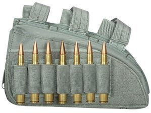 The fox butt stock Cheek rest - rifle has a non-slip padded Cheek rest with two hook and loop attached strips with elastic loops. Zippered utility pouch for extra storage. Available in a variety of colors.