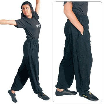 The sheer fabric is known in China as 'manmade cotton' and gives cool ventilation for sweaty workouts. Elastic waistband with additional drawstring, elastic cuffs, one side pocket. Great for Tai Chi practice.