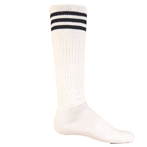 Three Striped Stretch Nylon Athletic Sock. Small fits a youth shoe size of 12-4, Ladie's shoe size of 4-5. Medium fits a Ladie's shoe size of 5-10, Men's shoe size of 4.5-8.5. Large fits a Ladie's shoe size of 11-12, Men's shoe size of 9-12.5.