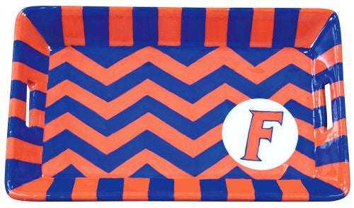 Jazz up your tailgate and University of Florida events with this energetic Gators mini tray featuring lively zig-zag lines of orange & blue across the 4"" x 7"" base and vertical lines up the 1-1/2"" sides to an opening of 8-1/2"" x 5-1/4"". The UF ""F"" logo in orange and outlined in blue is set in a white circle to give this dish a sophisticated, finishing touch. Hand painted ceramic8-1/2""L x 5-1/4""W x 1-1/2""H at top; 4"" x 7"" baseApproximately 1 lbFood, microwave & dishwasher-safeOfficially licensed NCAA collegiate product Use as a receptacle for used toothpicks, so the bottom of the tray stays visible or serve candy, nuts, mints, gum, garnishes, or party favors. Also, makes a nice subtle way to show your spirit at your home bar. PRODUCT FEATURES: University of Florida Gators Tide chevron-striped, ceramic, mini serving tray.Featuring alternating orange & blue zigzag stripes and the Florida ""F"" logo in the bottom right corner, this cute tray has tiny finger-handle cutouts at each end.8-1/2""L x 5-1/4""W x 1-1/2""H; 4"" x 7"" base; approximately 1 lb; food-safe, handpainted ceramic.Officially licensed collegiate product; serve lemons and limes or something that doesn't completely cover the logo.Create an impressive tailgate on a budget by mixing a few distinctive licensed products with unique items in school colors.